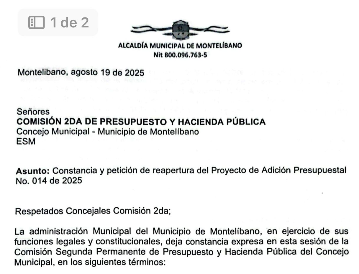 Lo anterior, debido a la negativa de los concejales que integran la Comisión Segunda del Concejo municipal de Montelibano, de no darle aprobación en estudio de comisión a un proyecto de adición presupuestal presentado por el alcalde en días pasados, cuya negativa se basó en la inconveniencia del proyecto. De acuerdo para los intereses del municipio y por lo cual se resolvió archivarlo.