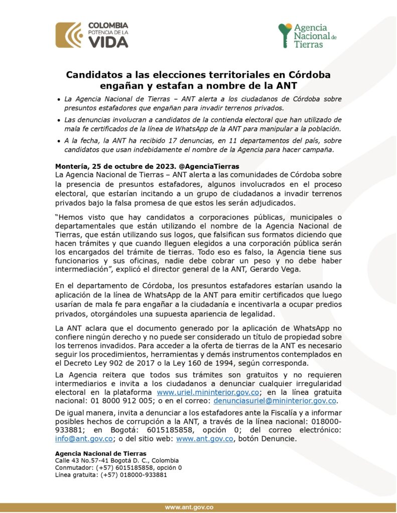 A continuación, compartimos un boletín de prensa para aclarar el mal uso de los certificados en nombre de la Agencia Nacional de Tierras. Es importante destacar que dichos certificados no confieren ningún derecho de titularidad, y queremos enfatizar que no respaldamos de ninguna manera este tipo de acciones.