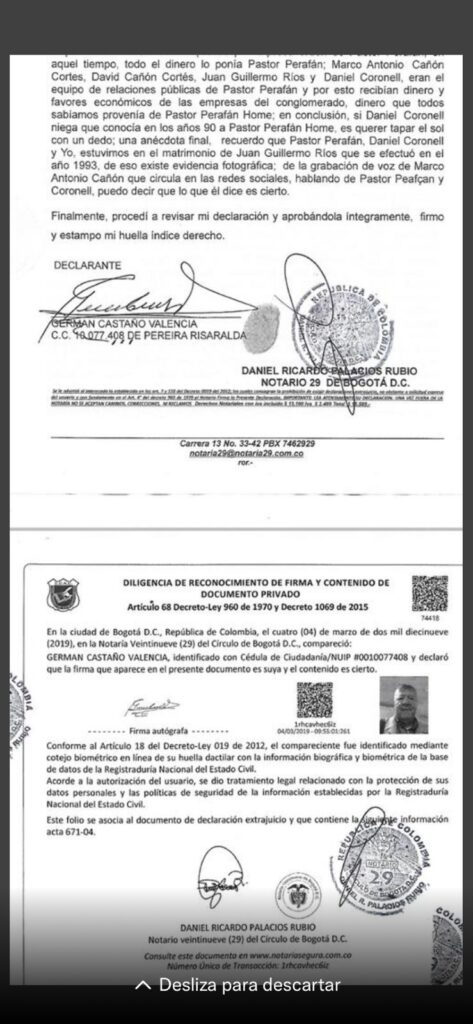 Asimismo, Germán Castaño Valencia compareció en la notaría 29 de Bogotá el día 4 de marzo de 2019, expresando bajo la gravedad de juramento que: “Marco y David Cañon, Juan Guillermo Ríos y Daniel Coronell, eran el equipo de relaciones pública de Pastor Perafán”.
