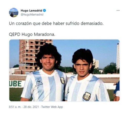 Con motivo del aniversario de la muerte del Diez, su imagen reapareció con fuerza en todo el mundo a través de entrevistas en las que lo recordaba entre lágrimas y sonrisas. “Un corazón que debe haber sufrido demasiado. QEPD Hugo Maradona”, se lamentó el ex futbolista Hugo Lamadrid a través de su perfil oficial de Instagram.
