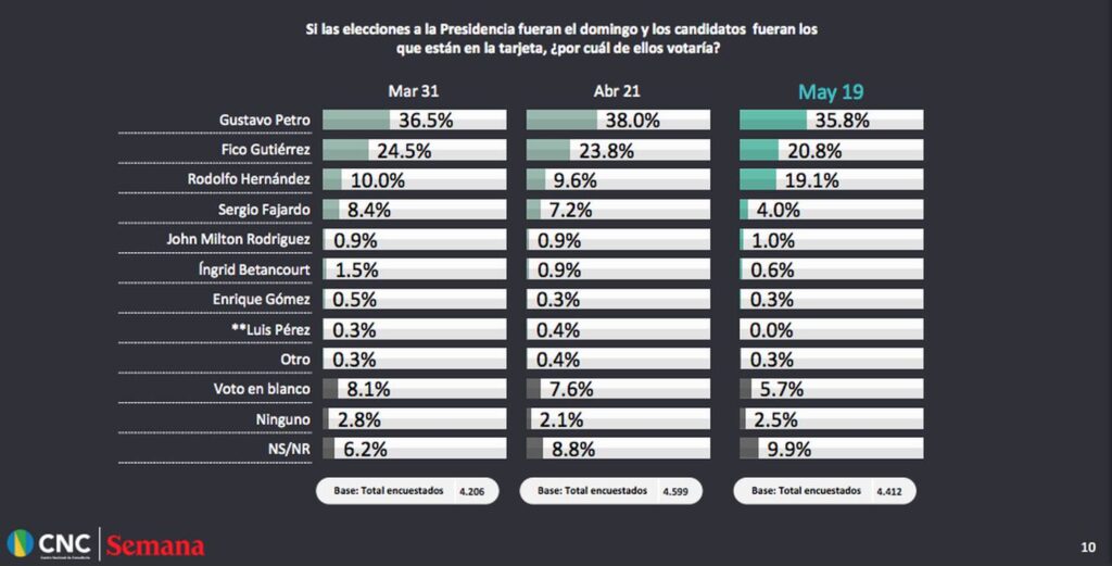 En la encuesta del CNC, el 35,8 % de los encuestados votaría por Gustavo Petro, mientras que el 20,8 % votaría por ‘Fico’ y el 19,1% por Hernández, lo que demuestra que el segundo y tercer lugar está casi igualado. En el cuarto lugar está Fajardo con el 4 %.