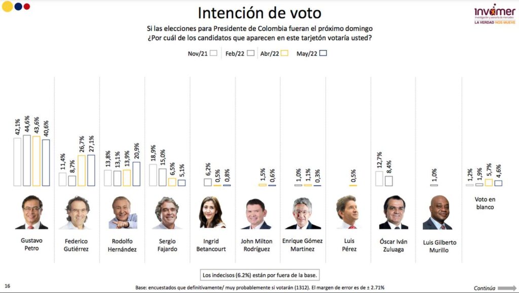 Y según la de Invamer, la intención de voto está así: Gustavo Petro con el 40.6 % de intención de voto, Federico Gutiérrez con el 27.1 %, Rodolfo Hernández con el 20.9. % y Sergio Fajardo con el 5.1 %.