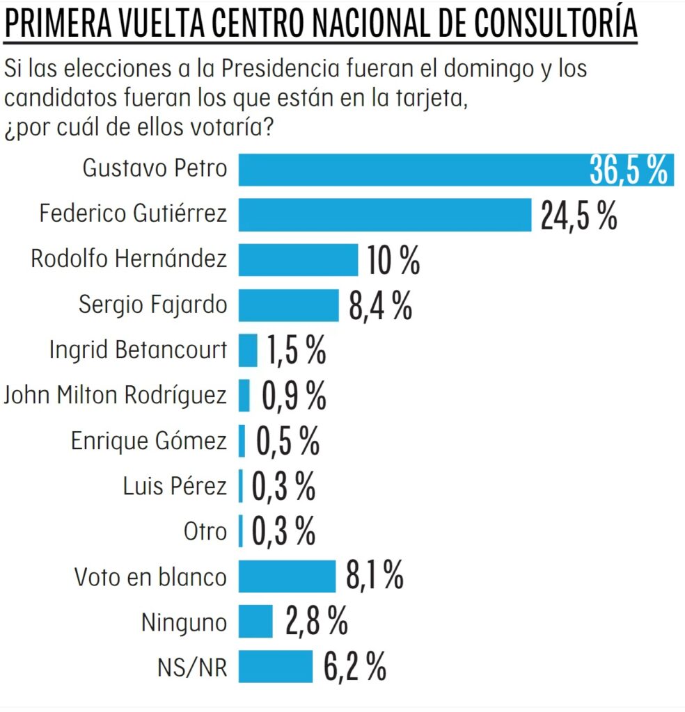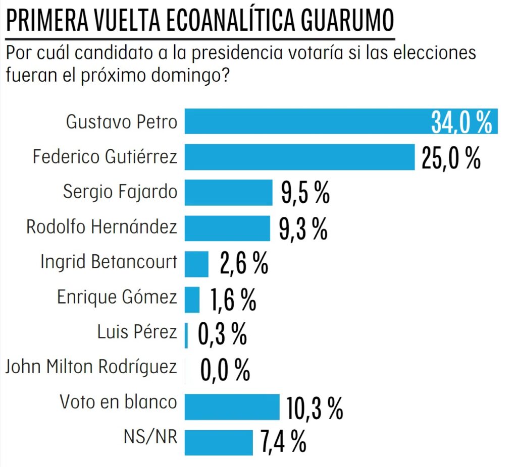 Gustavo Petro, 34 por ciento; Federico Gutiérrez, 25 por ciento; Sergio Fajardo, 9,5 por ciento; Rodolfo Hernández, 9,3 por ciento; Ingrid Betancourt, 2,6 por ciento; Enrique Gómez, 1,6 por ciento; Luis Pérez, 0,3 por ciento; John Milton Rodríguez, 0 por ciento; voto en blanco; 10,3 por ciento; no sabe/no responde 7,4 por ciento.