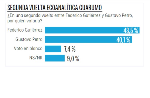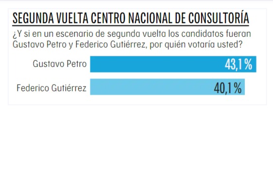 Y posteriormente, en el escenario de una segunda vuelta entre ambos contendientes, Gutiérrez obtendría un 43,5 por ciento de los votos frente a un 40,1 por ciento de Petro.