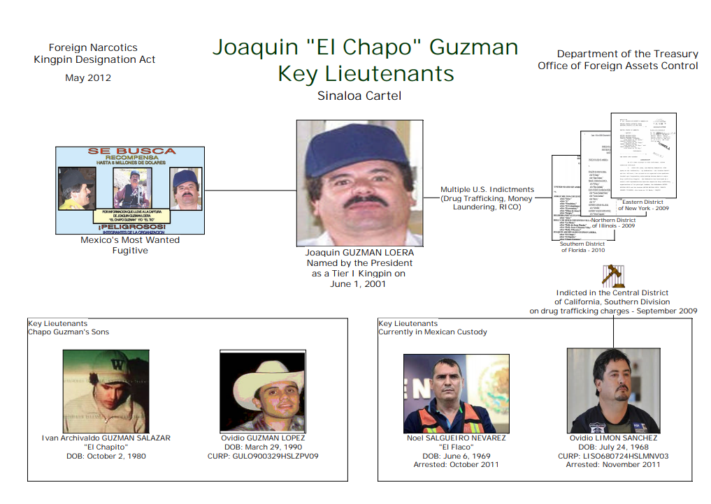 El Departamento de Estado de Estados Unidos ofrece una recompensa de hasta US$ 5 millones por información que pueda conducir al arresto y/o condena de cuatro de los hijos del exlíder del Cártel de Sinaloa Joaquín «El Chapo» Guzmán: Ovidio Guzmán López, Iván Archivaldo Guzmán Salazar, Jesús Alfredo Guzmán Salazar y Joaquín Guzmán López.