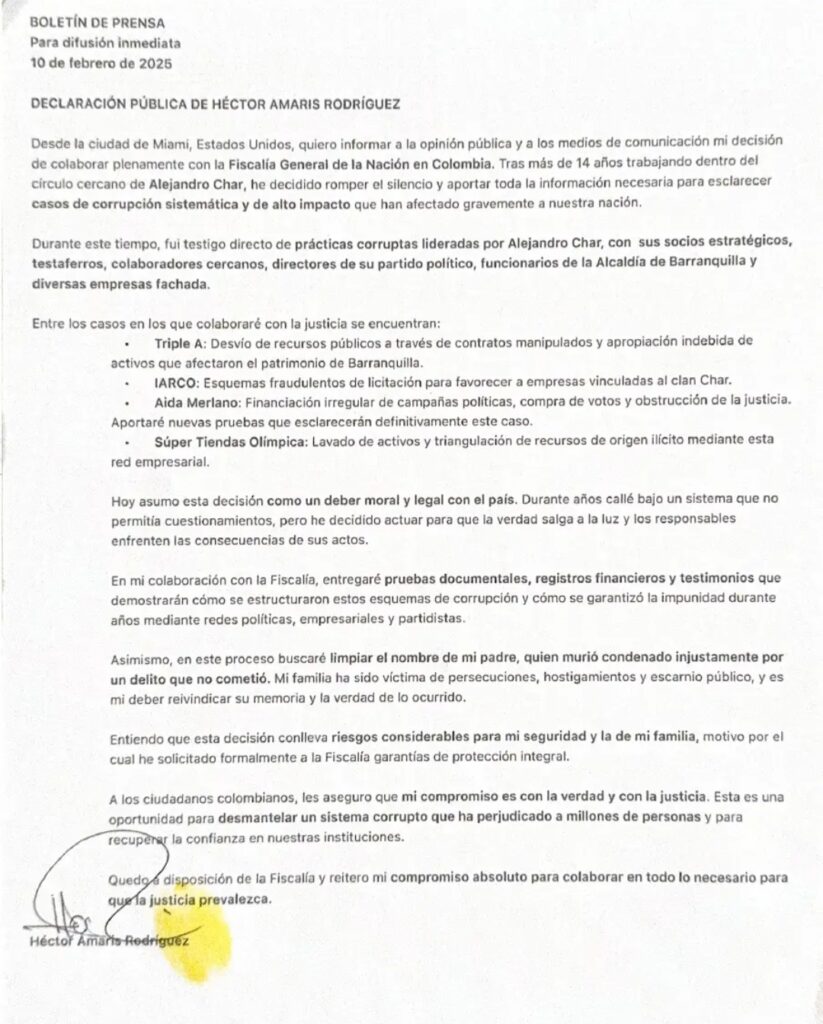En un comunicado, “Yogui” dice que fue “testigo de prácticas corruptas lideradas por Alejandro Char, con sus socios estratégicos, testaferros, colaboradores cercanos, directores de su partido político, funcionarios de la Alcaldía de Barranquilla y diversas empresas fachadas”. Asegura que aportará pruebas documentales, registros financieros y testimonios