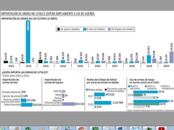 Pero además, dice la FIP, el mercado de estas armas ahora supera ampliamente al de las de guerra, sin que se sepa en qué están siendo usados esos elementos de juguete. Mientras en el 2009 el 70 por ciento de las armas que se importaban al país eran las de guerra y el 26 por ciento eran las no letales, esa tendencia comenzó a cambiar desde el 2012. Para el 2020, mientras el 0,59 por ciento de las importadas eran de guerra o armas de fuego convencionales, el 98 por ciento fueron de aire y principalmente de fogueo.