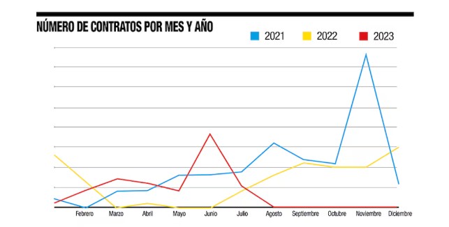 Solo en 2021 entre diferentes entidades del Estado tanto en regiones como a nivel nacional le entregaron 118 contratos por un valor de 132.916 millones de pesos. Pero el año más lucrativo, sin duda alguna, ha sido el del último Gobierno. Desde agosto de 2022 hasta julio de 2023 se han firmado 88 contratos que superan los 226.100 millones. El pico más alto de contratación que tuvo Aldesarrollo en este último periodo se registró entre junio y julio. Mientras el país vivía la tensión de que el Consejo de Estado anulaba la elección del contralor general, Carlos Hernán Rodríguez, se estaba gestionando un contrato que fue adjudicado a Aldesarrollo y otorgado el 10 de julio por un valor cercano a los 18.000 millones de pesos para ejecutar en cinco meses. La finalidad del contrato es “apoyar en la aplicación, construcción y optimización, a través de instrumentos que permitan el fortalecimiento de la gestión documental para el mejoramiento de las condiciones de acceso, uso y consulta de la documentación e información generada por la Contraloría General”.