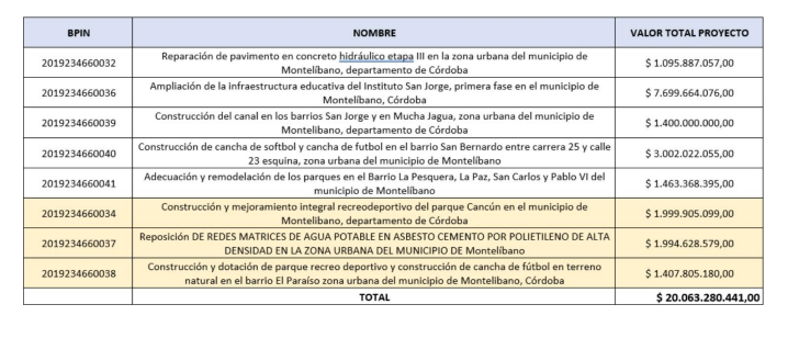 Con Código BPIN 2019234660039: Construcción del canal en los barrios San Jorge y en Mucha Jagua, zona urbana del municipio de Montelíbano, Córdoba con valor aprobado por el OCAD $1.400.000.000. Los proyectos antes mencionados con Códigos BPIN 2019234660034, 2019234660037 y