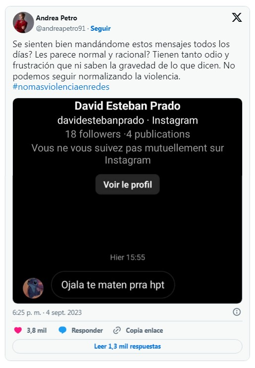 “Ojalá te maten prra hpta”, “cuide a su hija” y “usted va a terminar igual que su papá: muertos” son algunos de los hostigamientos que ha recibido la mujer principalmente a través de sus cuentas de Instagram y X, antes conocida como Twitter.