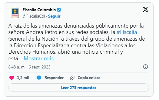 “A raíz de las amenazas denunciadas públicamente por la señora Andrea Petro en sus redes sociales, la Fiscalía General de la Nación, a través del grupo de amenazas de la Dirección Especializada contra las Violaciones a los Derechos Humanos, abrió una noticia criminal y está adelantando las labores investigativas correspondientes para determinar quién está detrás de las intimidaciones”, trinó la entidad.