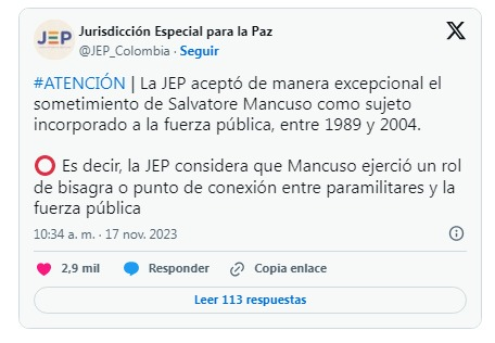 El exjefe paramilitar, Salvatore Mancuso, fue aceptado en la Jurisdicción Especial para la Paz (JEP). Así lo confirmó la justicia especial, al considerar que sus aportes son novedosos, concretos y suficientes para ganarse un cupo como “bisagra” o punto de conexión entre las Autodefensas Unidas de Colombia y miembros de la Fuerza Pública. En ese lapso de tiempo, Mancuso habría sido eslabón clave entre el grupo criminal de los hermanos Castaño con importantes mandos militares en algunos departamentos de Colombia.