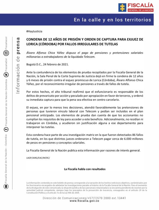 Ante la contundencia de los argumentos de la #Fiscalía, la Sala Penal de la @CorteSupremaJ dejó en firme la condena de 12 años y 6 meses de prisión contra el exjuez promiscuo de Lorica, #Córdoba, Álvaro Alfonso Chica Yáñez, por fallos irregulares de tutelas.
