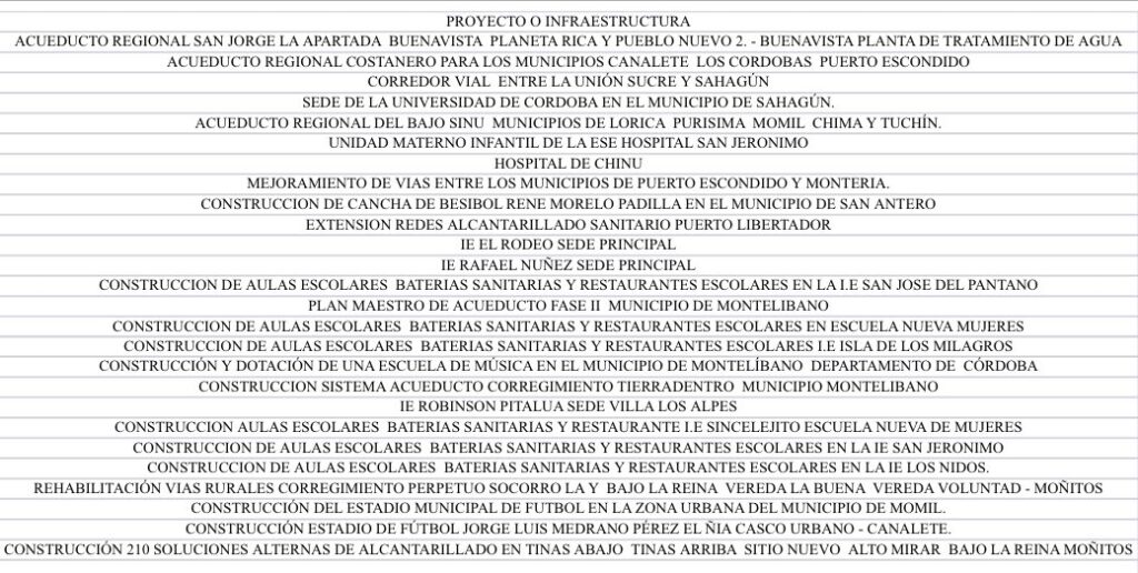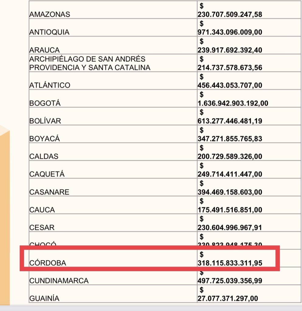 Anexamos valor exacto de los dineros que están por el momento embolatados en el departamento de Córdoba, equivalentes a 34 elefantes blancos.