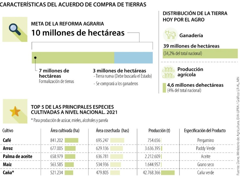 Precisamente la actividad rural se complementa con otras 4,6 millones de hectáreas dedicadas a la agricultura según el Dane. Aquí es donde están los vendedores potenciales de la reforma agraria de Petro. La Upra identificó el año pasado que los cafeteros, arroceros y palmeros son los de mayor extensión de tierra (con un hectareaje de 841.202, 677.005 y 658.979, respectivamente). Mientras que otros con buenos niveles de terrenos son los del maíz (563.585 hectáreas y le sigue la caña dedicada para la producción de azúcar, mieles, alcoholes y panela con 521.234 hectáreas. Por ahora ninguno de esos sectores ha confirmado que participe de la compra de tierras del Gobierno.