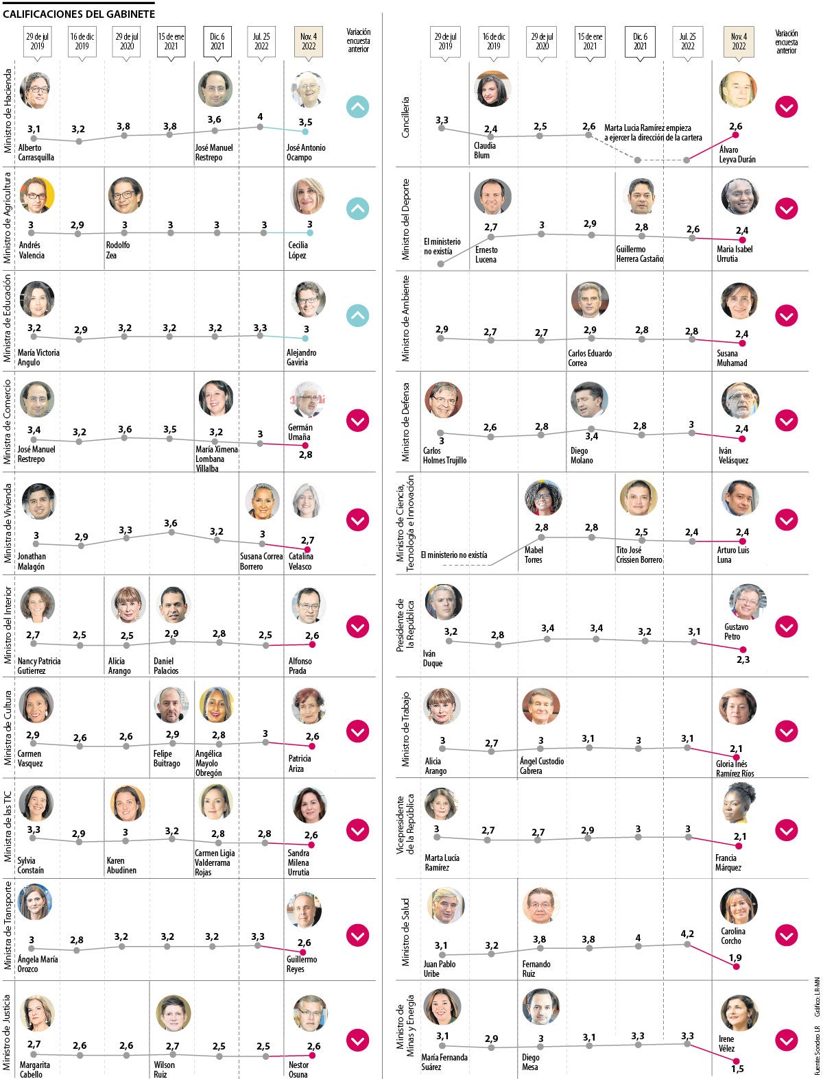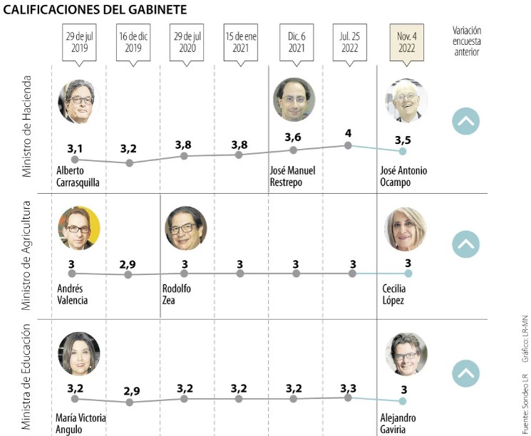 En la última parte de la tabla, en la que se puede decir que todos los ministros allí presentes ‘se rajaron’ en el sondeo, estuvieron las nueve carteras restantes y su calificación fue desde 2,4, como la más alta, hasta 1,5, que fue el piso.ARTÍCULO RELACIONADO