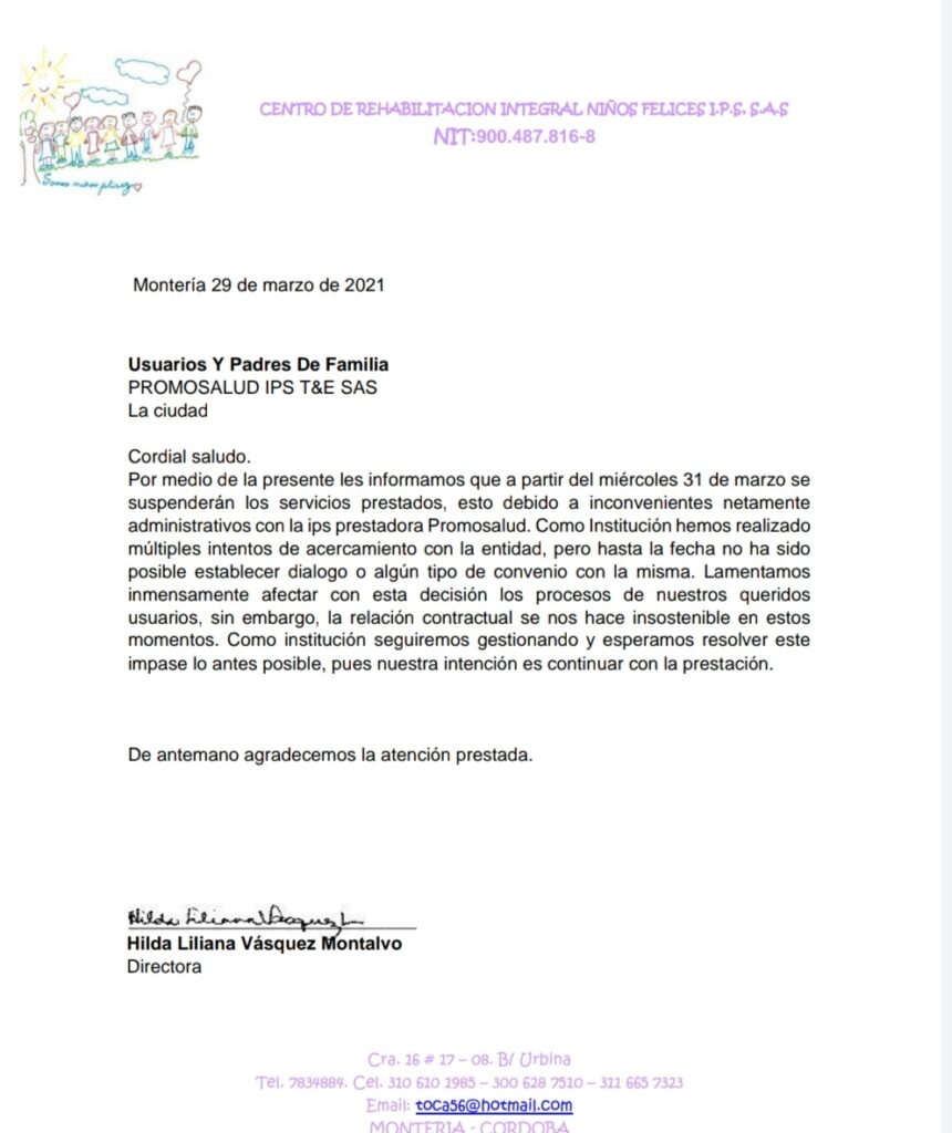 La IPS NIÑOS FELICES nos ha prestado un excelente servicio aun sin recibir pagos por parte de dicha entidad, pero ya se les hace imposible seguir prestando servicios a nuestros niños.